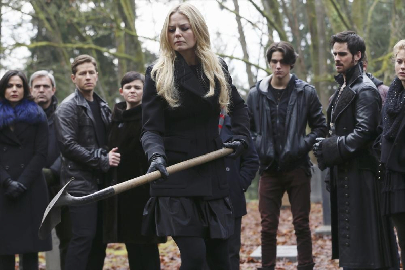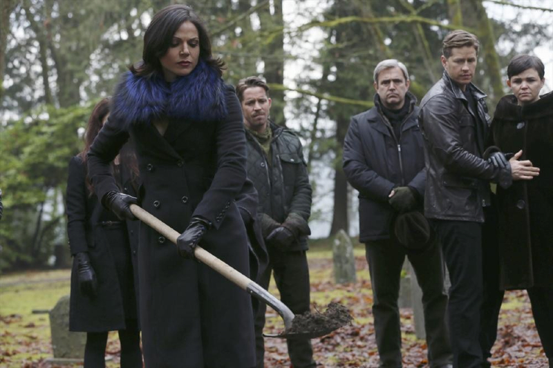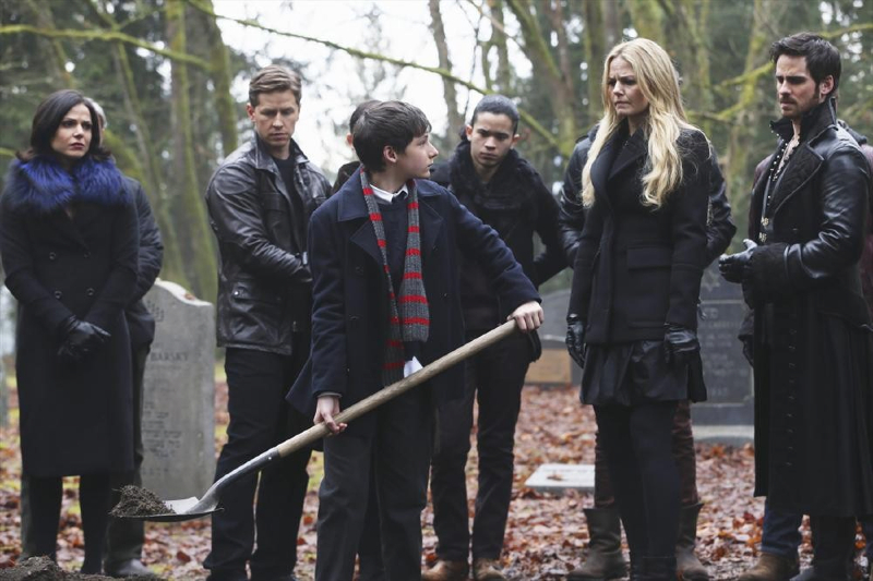 The photos also show the characters gathering to bury and mourn Neal. We’re going to go ahead and stock up on tissues for those scenes and it’s terrible that Rumple won’t be there to say goodbye to his son. But there are some familiar faces in the crowd that we haven’t seen in a while, including the Lost Boys, Blue and Tinker Bell.